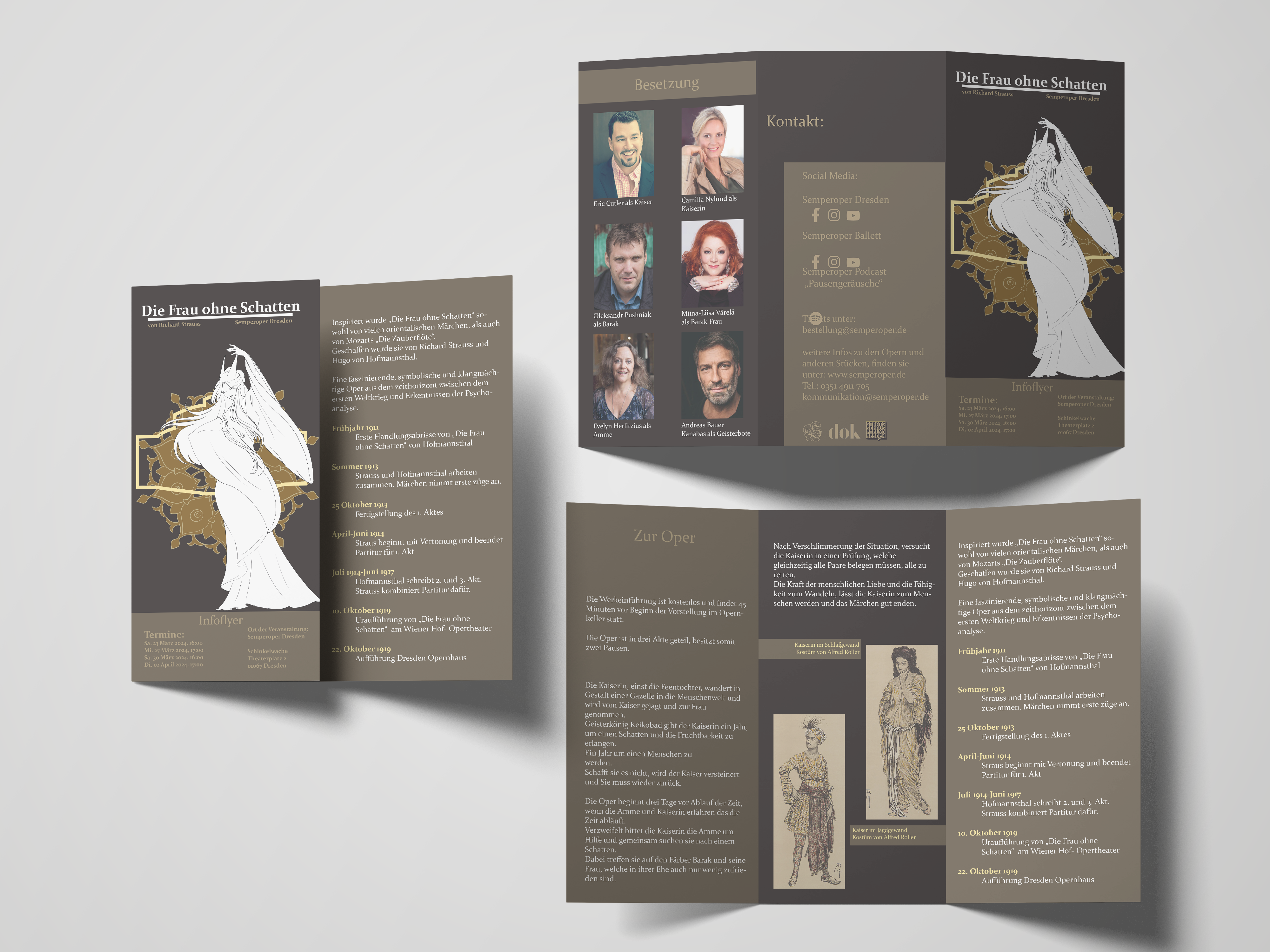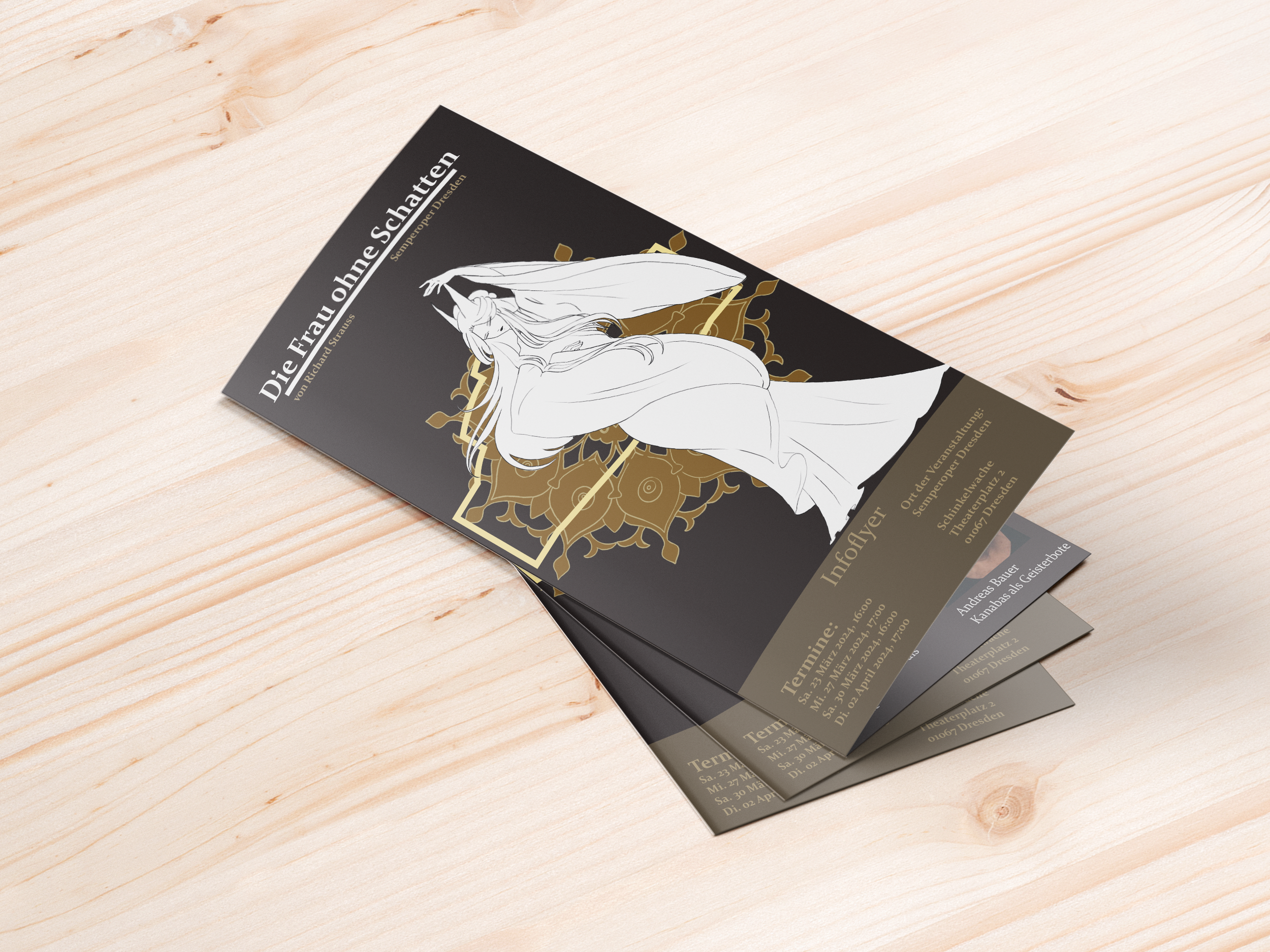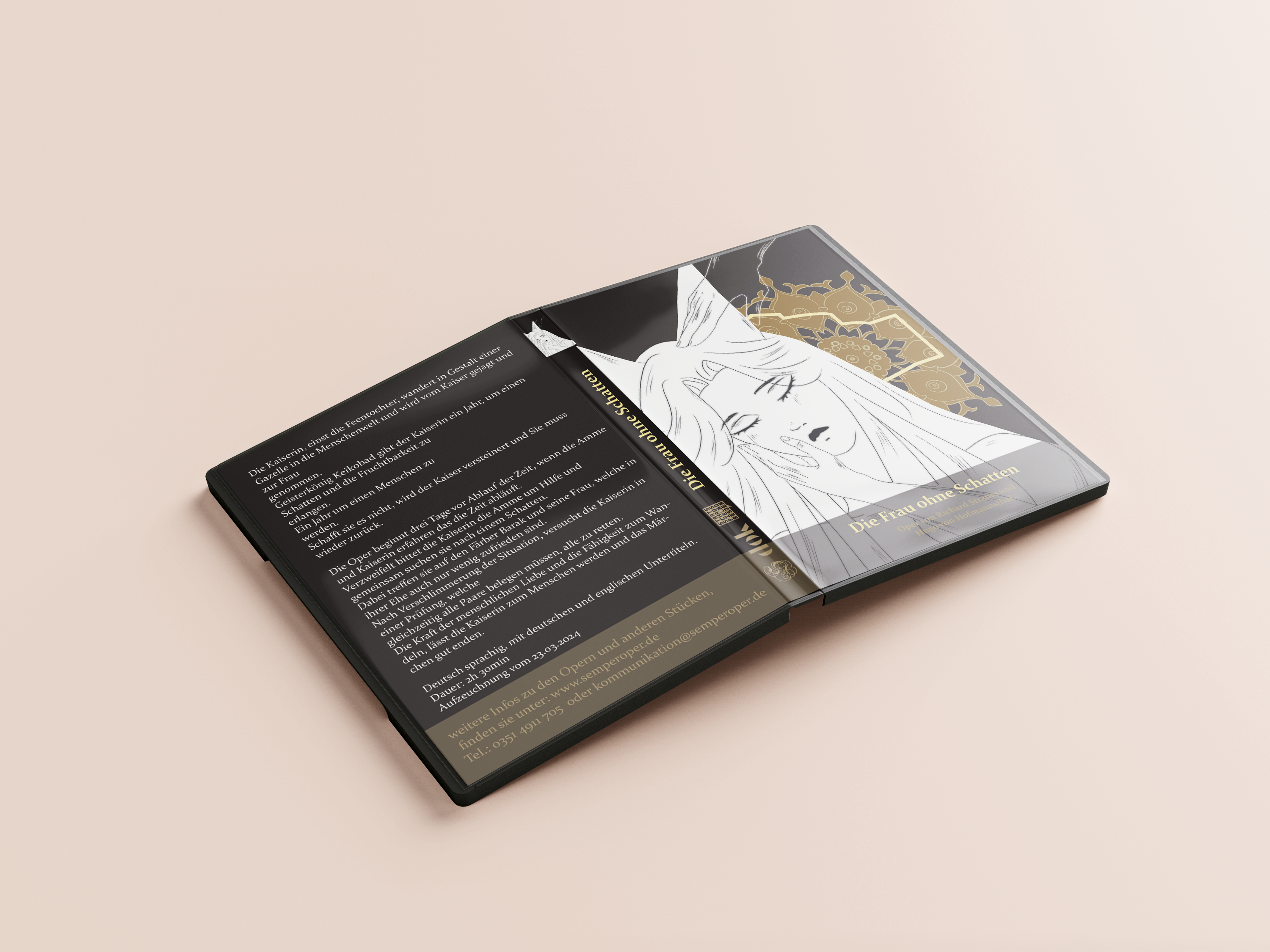 Gewünscht waren an hier ein Plakat, Flyer, ein DVD Inlay und ein DVD Cover. Wie deutlich zu sehen, habe Ich mir die Oper "Die Frau ohne Schatten" von richard Strauss und Hugo von Hofmannsthal ausgesucht und bearbeitet.
